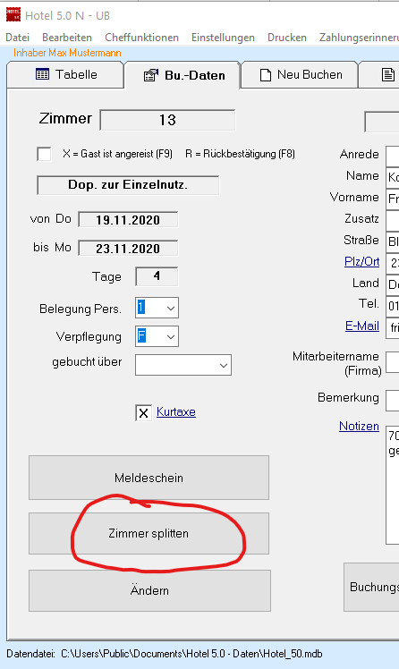 im Register Bu.-Daten finden Sie den Knopf „Zimmer splitten". Hier wird aus einer Buchung bzw. Rechnung 2 Rechnungen / Buchungen gemacht. Vorher sollte man den Zimmerpreis entsprechend halbieren. In einer Anleitung werden Sie bei Klick auf den Knopf entsprechend durchgeführt.